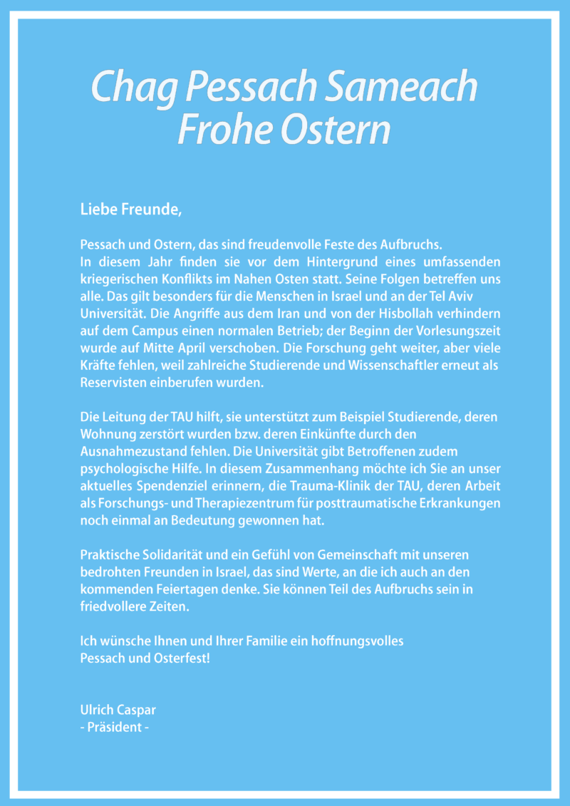 Auf unserer Homepage finden Sie Informationen über unseren Förderverein, unser laufendes Programm und natürlich viel Wissenswertes über die größte Universität Israels: Veranstaltungen, Neues aus der Wissenschaft und Geschichten vom Campus in Tel Aviv. Lernen Sie eine weltweit anerkannte Institution kennen, die auf vielen Feldern ganz vorne mitspielt: u.a. bei der Nanotechnologie, in der Neuroscience, Cybersecurity und in allen Fragen der Umwelt und ihres Schutzes. Die TAU will unsere globale Zukunft mitgestalten und Antworten auf Fragen finden, die alle angehen.